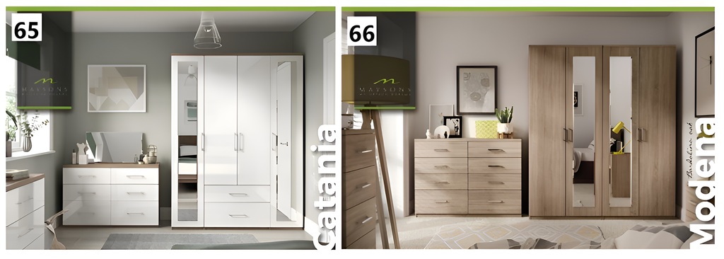 Catania and Modena bedroom ranges are available in a wide range of colours, either wood effect all over or wood carcass with a coloured front. The Catania range is available in two heights, standard height of 195cm or extra tall height of 223cm.