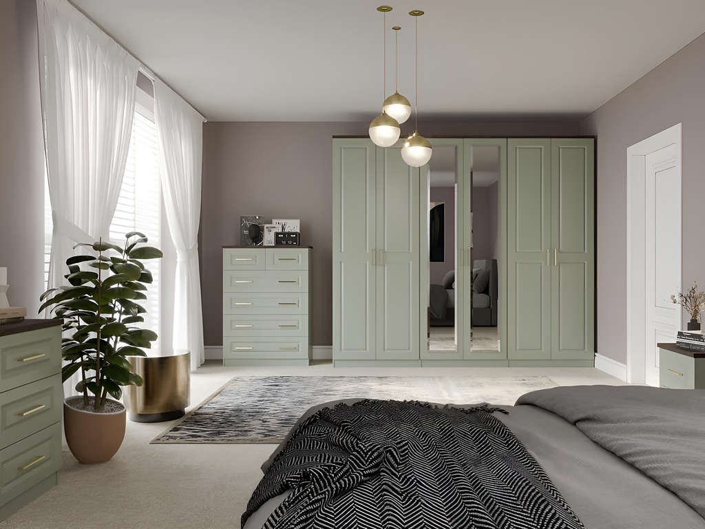 The Florence range is available in two heights, standard height of 195cm or extra tall height of 223cm. The range is available in reed green colour only, with a choice of Grey Nebraska top or natural Nebraska top and finished with a gold handle. Wardrobes and chests all have built in soft closures for that added touch of luxury.