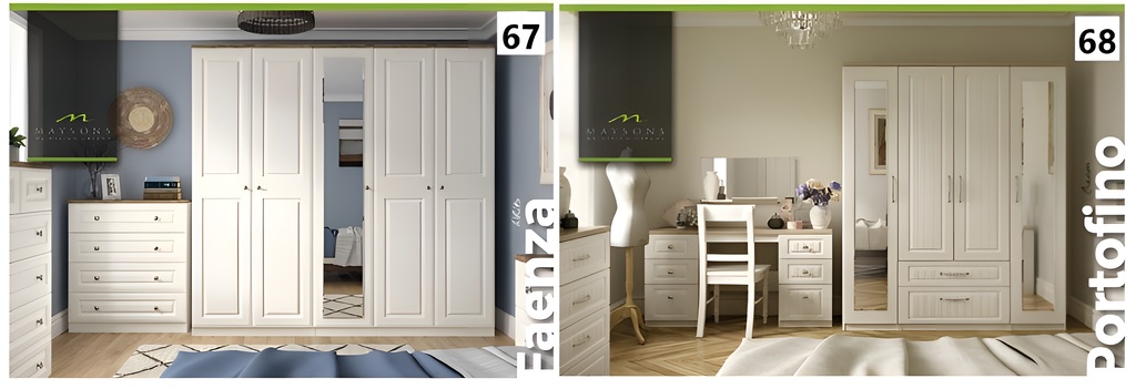 The Faenza range is available in two heights, standard height of 195cm or extra tall height of 223cm. The range comes in two colours, light grey or white finish with a Santa fe oak top. Choice of a silver or gold handles. Wardrobes and chests all have built in soft closures for that added touch of luxury. The Portofino range is available in white, cream or light grey finish with a natural Nebraska top.