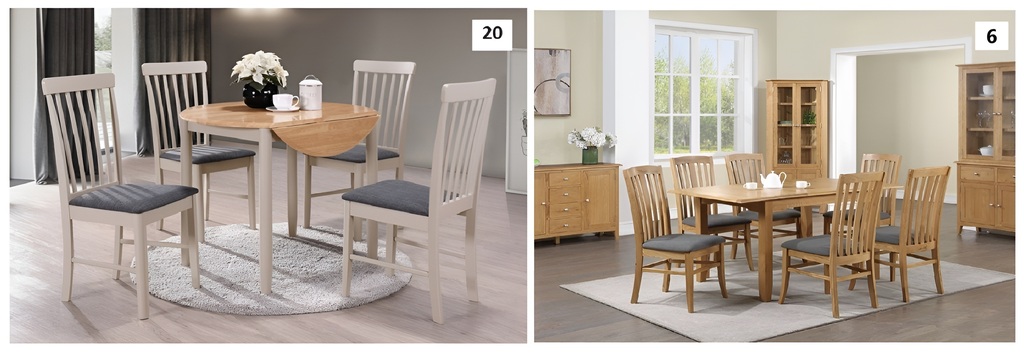 Altona range offers a range of small table and chair sets, finished in stone grey with light oak tops, chamfered tops and rounded legs. Made from solid hardwood. Kilkenny collection is a stunning collection of dining and occasional furniture crafted from solid oak and oak veneers. A contemporary collection of furniture offers curved edges, rounded corners and tapered legs with dove tailed drawers and a chrome handle. The Kilkenny collection offers a 160cm butterfly extension and a 120cm butterfly extension table with a solid oak dining chair with a charcoal fabric seat pad. A comprehensive cabinet collection will offer furniture for a variety of spaced within the hone.