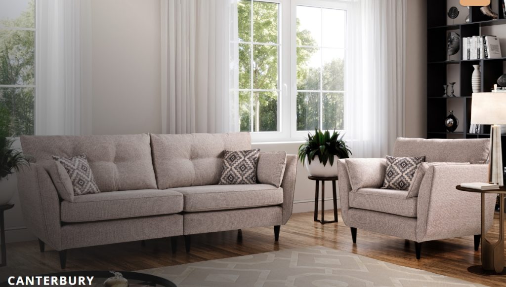 The Canterbury collection offers sophistication and style, with a range of sizes of sofas and chair which will grace any home. The unique arm detail adds a beautiful design feature and exemplary level of support and comfort. The continental design offers a firmer foam sit, high legs and set off by geometric scatters. This adds style, comfort and support, leaving you to relax in the knowledge you will be the envy of any visitor to your home. Available in: 4 Seater, 3 Seater, 2 Seater, Love Chair, Chair and Storage Footstool. Not on our shop floor display but is available to order. To find out more about the Canterbury range, click on the link. https://www.lebus.co.uk/range/canterbury