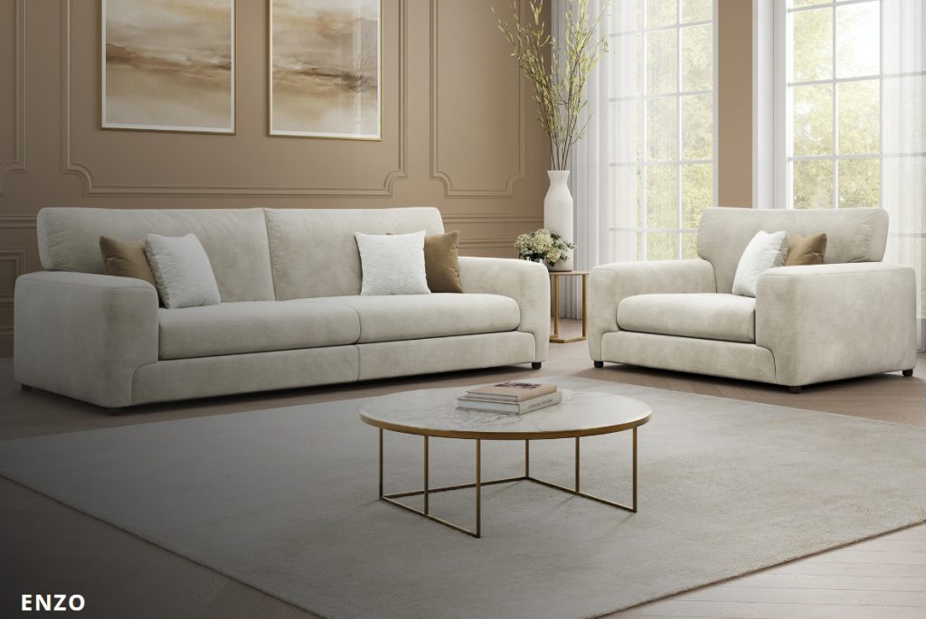he Enzo masterfully blends modern minimalism with a timeless style and inviting aesthetics. Its structured silhouette is defined by wide, low-profile track arms and deep seating that provides a grounded, sophisticated presence in any living space. Upholstered in a soft ivory-toned fabric, the piece offers a tactile warmth that is beautifully accented by a curated mix of cream and earthy taupe cushions. Beyond its visual appeal, the design prioritises ergonomic comfort and versatile styling. The high back cushions offer generous support for lounging, while the subtle dark or light finished cylindrical legs provide just enough lift to keep the profile sleek. Whether anchored in a Scandi-chic apartment or a contemporary family room, this sofa serves as a beautiful, luxurious centrepiece that balances clean architectural lines with undeniable comfort. Available in: 4 Seater, 3 Seater, 2 Seater, Love Chair, Chair and Storage Footstool. Not on our shop floor display but is available to order. To find out more about the Enzo range, click on the link. https://www.lebus.co.uk/range/enzo