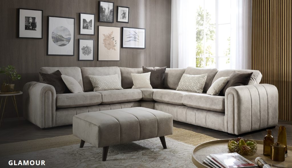 The Glamour collection epitomises everything Glamourous, elegant lines, plush sumptuous body fabric, sophisticated accent cushions all finished off with rich gold piping details framing the front arm facing. The model has striking features, as well as the gold piping on the arms. The front border is quilted offering drama and comfort, it’s generous proportions allowing you to chill out in style . The Glamour has an Art deco influence which is evident in the dome design shape of the arms and layered facing, the low wooden foot is this models finishing touch. Piping options: Gold, Silver or Self piped. Available in: Grand Sofa, 4 Seater, 3 Seater, 2 Seater, Love Chair, Chair, Corner Unit Accent Chair and Accent Footstool. Not on our shop floor display but is available to order. To find out more about the Glamour range, click on the link.https://www.lebus.co.uk/range/glamour