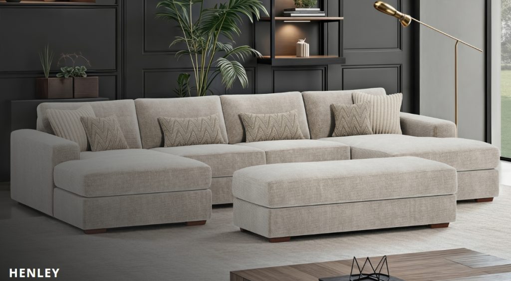A contemporary modular sofa made for relaxation and flexibility, with it’s high back and generous shape appeal, offering deep cosy seats and plenty of support and space to stretch out in comfort. The Henley has a modern on-trend design which offers you the chance to design your own seating space in your living room. The beautiful soft textured chenille fabric is complemented by a mix of cosy cord and chevron patterned scatters. Available in: A wide range of Corner units, 4 Seater, 3 Seater, 2 Seater, Chair, Large Footstool and Small Footstool. Not on our shop floor display but is available to order. To find out more about the Henley range, click on the link. https://www.lebus.co.uk/range/henley