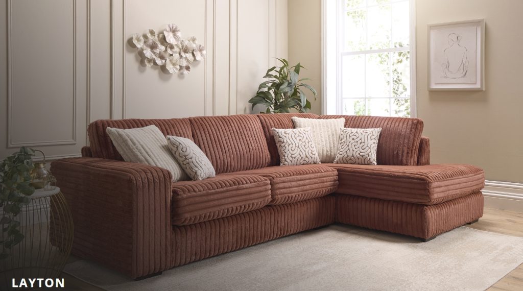 Layton is a contemporary design made for you to relax into, it’s soft cosy seats and backs offer comfort and gentle support, the generous proportions allows room to lie back and put your feet up. The Layton’s on-trend design is set off by the beautiful soft high piled sculptured cord fabric which is complimented by contrasting coloured large scatter cushions, and modern pattern on the smaller cushions which all add up to a striking statement in any style of home. Available in: 4 Seater, 3 Seater, 2 Seater, Chaise Corner Unit, Chair and a Footstool. Not on our shop floor display but is available to order. To find out more about the Layton range, click on the link. https://www.lebus.co.uk/range/layton