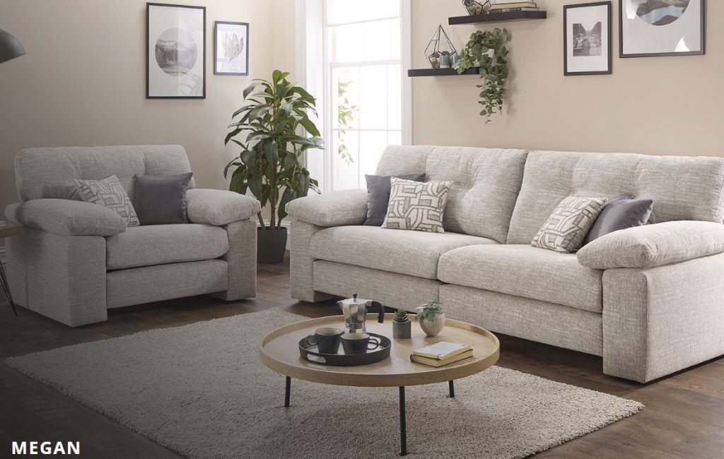Contemporary design made for relaxation, with it’s deep cosy seats and soft arm bolsters offering plenty off space to stretch out in comfort. The Megan’s on-trend design of floating seating area nestled between two strong cradling arms. The beautiful soft chenille fabric is complimented by luxurious velvet and modern geometric design scatter cushions which will make a striking statement in any style of home. Available in: Corner unit, 4 seater, 3 Seater, 2 Seater, Chair, Accent chair and Storage Footstool. Available to view in-store .To find out more about the Megan range, click on the link. https://www.lebus.co.uk/range/megan