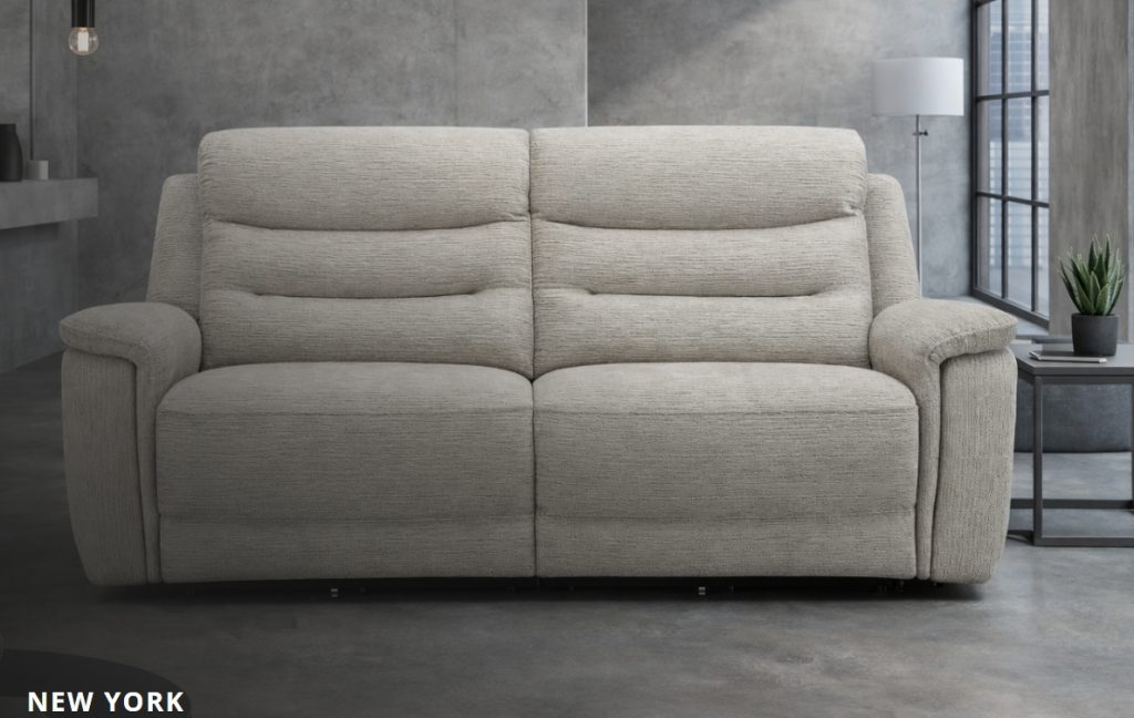 The New York recliner range seamlessly merges refined contemporary aesthetics with the ultimate lounging experience. Designed to be the centrepiece of any modern living space, each piece features a fully sprung base with padded arm rests and back cushions offer support without sacrificing softness. Beneath its elegant exterior lies a sturdy hardwood frame, ensuring the durability and long-term reliability your home deserves. Finding your perfect relaxation angle is effortless thanks to the integrated smooth electric reclining functionality, allowing you to transition positions at the simple touch of a button. Whether you are outfitting a cosy corner or a spacious lounge, the range offers total flexibility with 3-seater, 2-seater, and armchair options. Finished in a premium, soft natural fabric, the New York range brings a warm, understated elegance to your home that feels just as good as it looks. Not on our shop floor display but is available to order. To find out more about the New York range, click on the link. https://www.lebus.co.uk/range/new-york