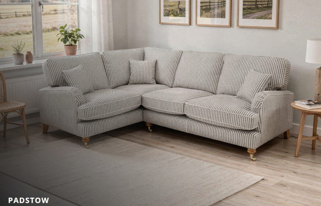 The design features elegant scroll arms, tailored piping for a high quality finish. Every detail, from the neat piped edging to the matching scatter cushions, reflects a commitment to high-quality craftsmanship and enduring style. The sofa is built for both comfort and sophistication, supported by a high back designed for ergonomic lumbar and shoulder support. It sits atop beautifully turned wooden feet in the choice of oak and mahogany finish, with the front legs featuring vintage style brass casters for a touch of period style flair and easier mobility. Available in: 4 Seater, 3 Seater, 2 Seater, Love Chair, Chair and Storage Footstool. Not on our shop floor display but is available to order. To find out more about the Enzo range, click on the link. Available in: Corner unit, 3 Seater, 2 Seater, Love Chair, Chair and a matching Storage Footstool. Not on our shop floor display but is available to order. To find out more about the Padstow range, click on the link. https://www.lebus.co.uk/range/padstow