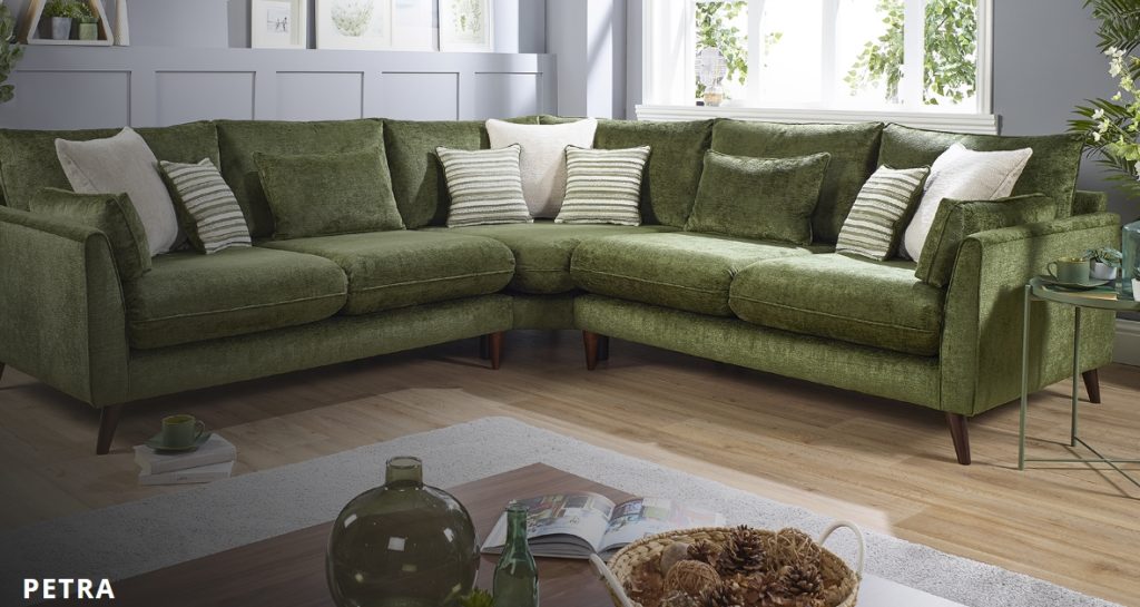 A classic design with a contemporary twist which would live happily in a traditional or modern living space. An extremely comfortable sit with high back cushions and arm bolster wraps you in luxurious support, the striking accent cushion offers both style and flare. A choice of wood colour just adds that finishing touch to any interior theme. Available in: 3 Seater, 2 Seater, Armed Corner Unit, Chair and a matching Accent chair and Storage Footstool. Not on our shop floor display but is available to order. To find out more about the Petra range, click on the link. https://www.lebus.co.uk/range/petra