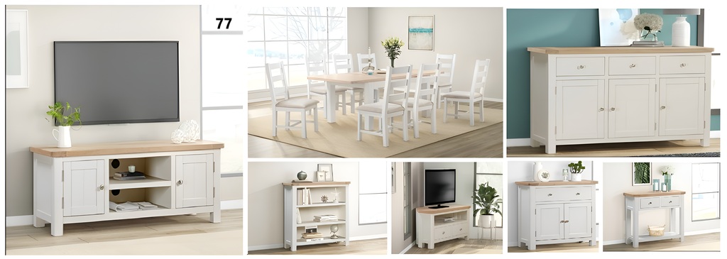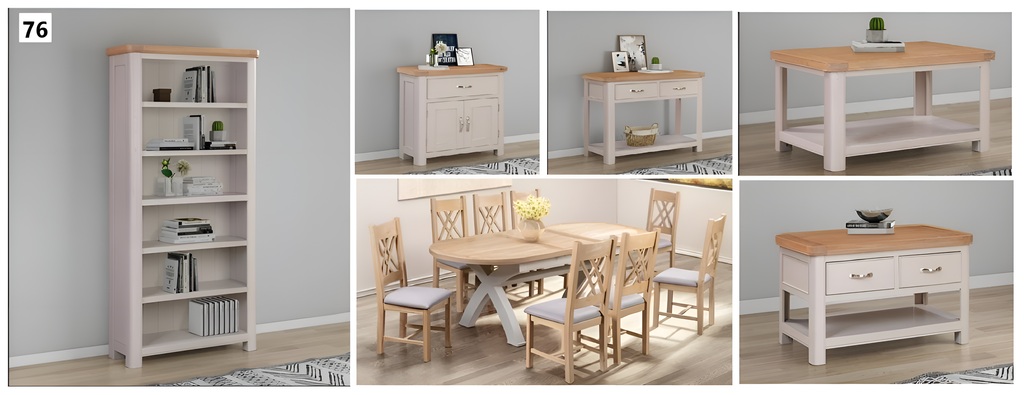 The Chatsworth dining range manufactured in oak and characterized by its curved edges, classic moulding and natural finish: this range is an elegant addition to any room. The Chatsworth range also comes in painted putty grey colour so that texture of the grain can still be seen, the top is given a light grey wash.